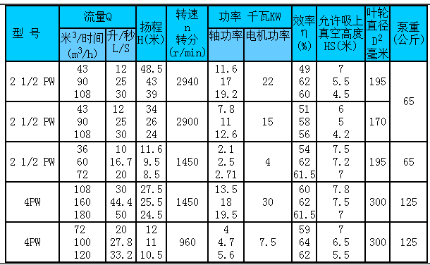 PW型污水泵是臥式單級懸臂式離心泵。適于抽送80℃ 以下帶有纖維或其它懸浮物的液體,供城市、工礦企業(yè)排除污水、 糞便之用。 21/2PW 21/2一泵吐出口口徑為2'/2寸,即65毫米P-雜質(zhì)泵   W-污水 2PNL 2-吐出口徑被25除所得值P-雜質(zhì)泵 N-泥漿 L-立式 PW型污水泵是臥式單級懸臂式離心泵。適于抽送80℃ 以下帶有纖維或其它懸浮物的液體,供城市、工礦企業(yè)排除污水、 糞便之用。 21/2PW 21/2一泵吐出口口徑為2'/2寸,即65毫米 P-雜質(zhì)泵 W-污水 2PNL 2-吐出口徑被25除所得值P-雜質(zhì)泵 N-泥漿 L-立式